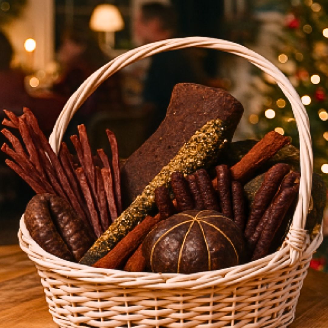 Festlig gavekurv på 5,11 kg med et bredt utvalg av røkte og tørkede produkter. Smakene er balanserte og passer både til småretter og større selskaper.